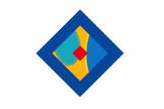 The flag of Port-Barcarès, a seen in September 2008, is white with the marina's logo, which reproduces the local topography. Port-Barcarès is represented by the red diamond, placed on the yellow spit separating the lagoon (lighter blue) from the sea (darker blue). The whole is framed in a thick dark blue square diamond.