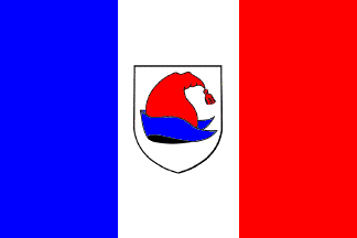 The flag of Guebwiller, hoisted on the town hall (photo, is vertically divided blue-white with the municipal coat of arms in the middle. The colors of the flag are taken from the arms.