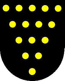 According to Divi Kervella (Emblemes et symboles des Bretons et des Celtes [ker], headword 'Armoiries', p. 20, col. ill. p.19), the coat of arms of Cornwall is "sable, fifteen golden bezants placed 5-4-3-2-1". The arms might be dated 1337, when Edward (the Black Prince), son of the King of England Edward III, was made Duke of Cornwall. The golden bezants on sable were already present as border of the shield of Richard, made count of Cornwall by his brother Henry III of England. The origin and meaning of the design are disputed.
