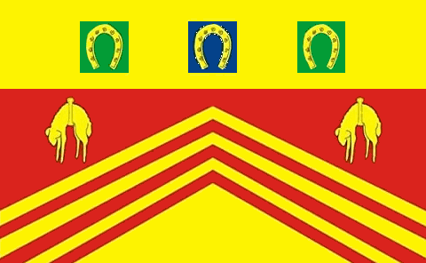 • Arms: Per chevron Gules and Or in chief two Fleeces and in base three Chevronels counterchanged on a Chief of the second a Billet Azure between two Billets Vert each charged with a Horseshoe Gold.