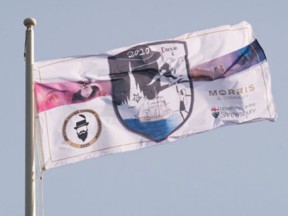 Placing a community's name across the horizontal red bar is a common manufacturer's solution for cities without a clear cut design for their flag, such as this example.