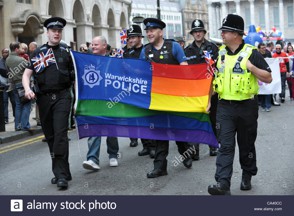 The Warwickshire Police officers marched with this special rainbow flag to celebrate gay rights at the Birmingham Pride Carnival Parade held on 2 June 2012.