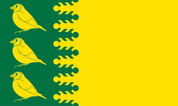 "The Finchfield Flag is a community flag proclaiming the unique identity of this district of Wolverhampton (Staffordshire). The goldfinches of the Finchfield Flag represent the birds that helped to give the town its name. They are placed on the left of the flag to show their importance. The yellow colour represents the traditional farmers fields of old and the green represents the modern parks and environment centre, as well as the colours of the local schools. The patterned line represents the agriculture that has been always been important to the town and shows how the past (yellow) and present (green) connect together."