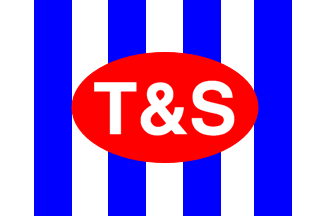 Lloyd's Book of House Flags and Funnels (1912) shows the house flag of Taylor & Sanderson Steam Shipping Co., Ltd. (#991, p. 84) as white with four vertical blue stripes and a red oval inscribing the white letters "T&S".