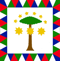 President Obiang had in the army (in the Spanish army I suppose, since he obtained his title in Spain). The six stars are not explained, but they should correspond to the districts. The tree, whose name in English do not know (in Spanish is "CEIBA") figure in the national shield. In the design one of red background is mentioned that the tree and the stars were bordered by some branches of cocoa plant, but was not published their design.