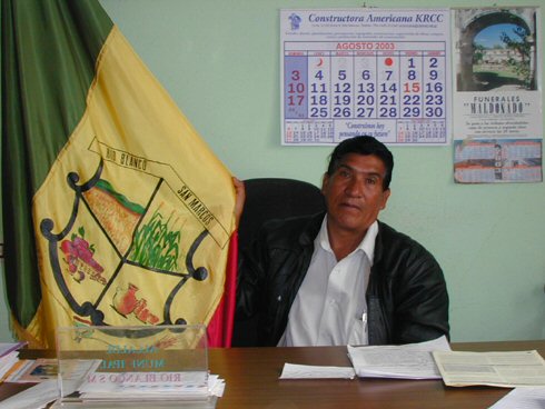 Río Blanco, San Marcos - According to photo at <www.inforpressca.com> - the flag is vertical green-yellow-red and charged with the Coat of Arms.