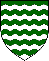 The coat of arms of the Town of Duga Resa is in a triangular heart-shaped shield 13 equally wide alternating green-white (silver) wavy bars (ribbons), the first at the top being green.