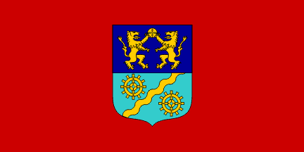 The coat of arms of the Town has a semi-circular shield shape. On red from a silver/white millwheel is issuing a golden/yellow lion with a sword in its paws.