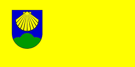 The flag - on a yellow background (the colour of wheat) of the official flag in proportions 1:2 in the left top corner there is the coat of arms of the Municipality.