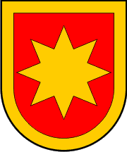 ... in a shield shape. It is coloured red bordered with golden (yellow). In the centre of the coat of arms is a golden (yellow) eight-pointed star.