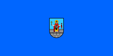 The flag is prescribed in proportions 1:2, blue with the coat of arms of the Town in the middle.