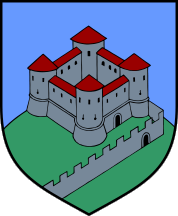 The coat of arms is described to be in stylized shield shape, showing in a light blue field on a green mount a castle with four towers connected with walls, all with red roofs. In the base is a silver wall with a red roof connected with an angle to the right tower. In the frontal wall connecting two towers are double doors with a semi-circular top. Over the castle to the left is raising a silver cliff. The shield is bordered golden.