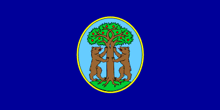 Description of the coat of arms: In an oval shield, on a blue field, on a green mount, in the centre a tree - proper, brown trunk and branches, green tree top and ten red fruits, accompanied with two bears of brown fur, red armed, with their front paws reclining the tree.