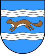 The coat of arms is "Azure between two bars wavy argent a marten passant proper".