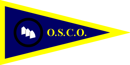 The burgee of the club (website) is blue, bordered yellow with three white Optimist class sails within a black ring and the yellow initials "O.S.C.O.", for "Optimist Sailing Club Opatija" or "Opatija Sailing Club Optimist".