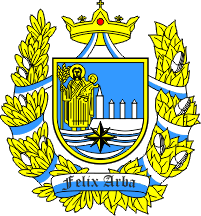 green) with black olivesand acorns. The ribbon is layed beneath the shield, golden with black inscription in Roman letters. The stripes of the waves beneath the town are irepresented straight.