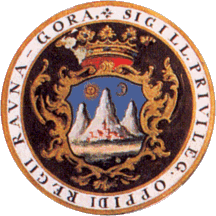 The flag is light blue with the historical seal in the middle. The town was granted Royal Free Market rights in 1785 by Emperor Joseph II, together with a coat of arms. The style of the coat of arms, shown by Oštrić [osg02], was similar to others granted in the period, with coat of arms in a cartouche surrounded with a white ring to form a seal, all within a baroque allegorical scene.