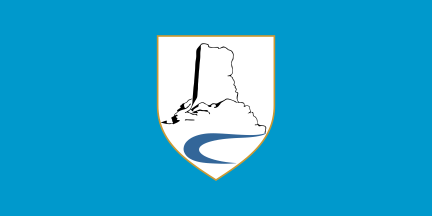 The flag is blue with a yellow bordered coat of arms in the middle.