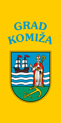The flag of the municipality of Komiža is the Croatian tricolour that has in the centre, instead of the coat of arms of the Republic of Croatia, the coat of arms of the municipality of Komiža.