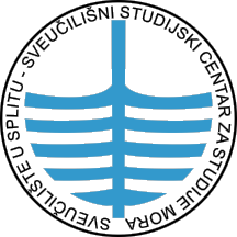 The emblem is prescribed in Article 7 of the Department Regulations Pravilnik o radu i organizaciji Sveučilišnog odjela za studije mora (text), adopted on 25 January 2013, The emblem consists of a circular seal shape with light blue stylized fish bones, symbolizing thebow of a ship and waves, encircled with the Department name in black. Prior to 2011 the previous name was used within a black circle.