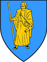 The arms, "Azure St. James stantant holding a staff in his dexter and a scroll in his sinister and wearing a bag ensigned with a scallop all or", refer to the St. James church, built in Gunja in 1849. The scallop on the bag is the traditional ecclesiastic attribute of St. James.