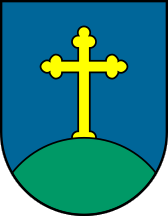 The coat of arms of the municipality of Križ is divided in two fields. In the blue field on a green hill is a golden Latin cross shaped as shown in the coat of arms of the Križ Subcounty of 1875. The use of such a cross in the coat of arms of the municipality of Križ is linked with the historical coat of arms of the Križ Subcounty. The Latin cross in the coat of arms of the municipality of Križ is set on a hill showing the topographical shape of the hill upon which the settlement of Križ is located. The cross symbolises also the name of the Parish of the Exaltation of the Holy Cross as well as that of the settlement and of the municipality. The green colour in the coat of arms symbolizes the green fields of the municipality of Križ surrounding the settlement of Križ.