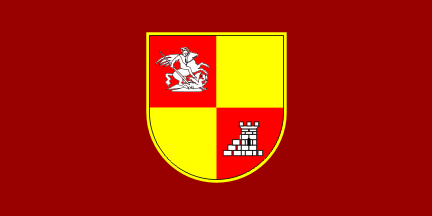 The flag is dark red with the coat of arms, bordered yellow, in the middle.