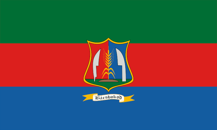 Below the shield, on a gold ribbon broken twice, the inscription 'Bácsbokod' is written in black.
