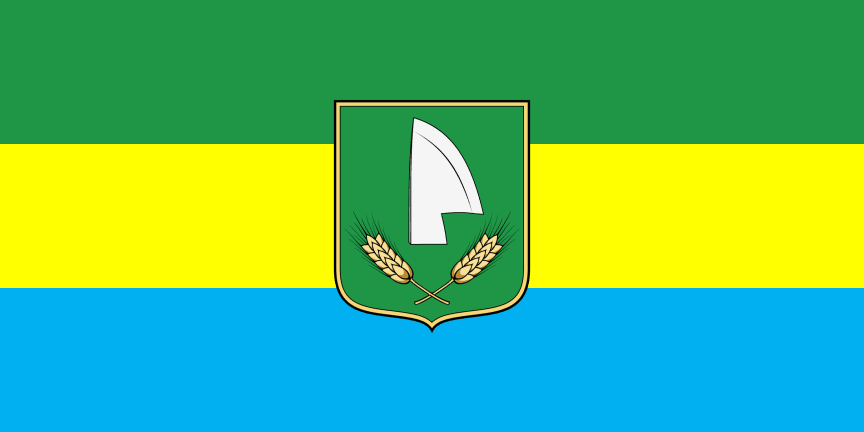 The coat of arms is a green shield with a gold border charged with a silver plowshare, surrounded on both sides by golden ears of wheat with their stalks touching at the bottom. The green color is a symbol of the spring landscape and renewal, of hope. Green is the color of nature. It symbolizes development, harmony, and security. The silver-white color refers to light, goodness, innocence, simplicity. It expresses the respect and honor of work.