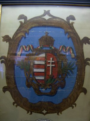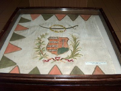 "BANNER OF THE NATIONAL GUARD UNIT OF TORDA COUNTY - A double-sheet banner made in 1848 from silk, embroidered and painted. Size 94/89 centimetres. Inventary number: 22/ZI. On its front side there is an embroiered blazon with the crown and the traditional Baroque-style shield bordered by a wreath of olive branches. In the right field there are four silver fesses. The reverse side displays the arms of Torda County. The three free edges are bordered with triangles facing each other in the national colours. The banner is unusally suspended, the axis of the escutheon forming a right angle to the staff. It was probably used either by the 11th Székely (Szekler) or by the 15th Mátyás (Matthias) huszár (cavalry) regiment. According to the Russian records it was seized by the Russian troops at Világos from Bem's army corps. It was returned to Hungary first in 1941. In 1948 it got to the Military History Museum. Restored by Márta Tóth in 1998."