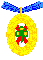 the Ensigns of the ORDER, being a golden Medal, on which shall be impressed Saint Patrick's Cross, fixed in a Heart, over which is a Crown. The whole being set round with an emblematic Knot embellished with Trefoil, or Shamrogue Leaves, and this motto, FIDELIS, ET CONSTANS: implying Fidelity and Constancy in Religion, Loyalty, and Friendship.