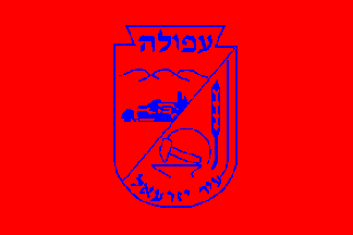 I spotted a light blue flag with blue emblem. The municipal emblem was published in the official gazette (Rashumot, Yalkut HaPirsumim), YP 631, 30 October 1958, in the first batch of emblems, for the then Local Council Afula.
