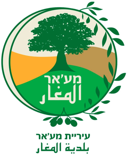 Keywords: maghar | mughar | el-maghar | mo'atza mekomit mughar | majles el-mughar el-mahaly | text: hebrew (green) | text: arabic (green) | text: english (green) | coat of arms: per fess (tree: green) | coat of arms: per fess (m |