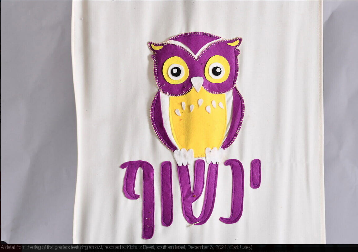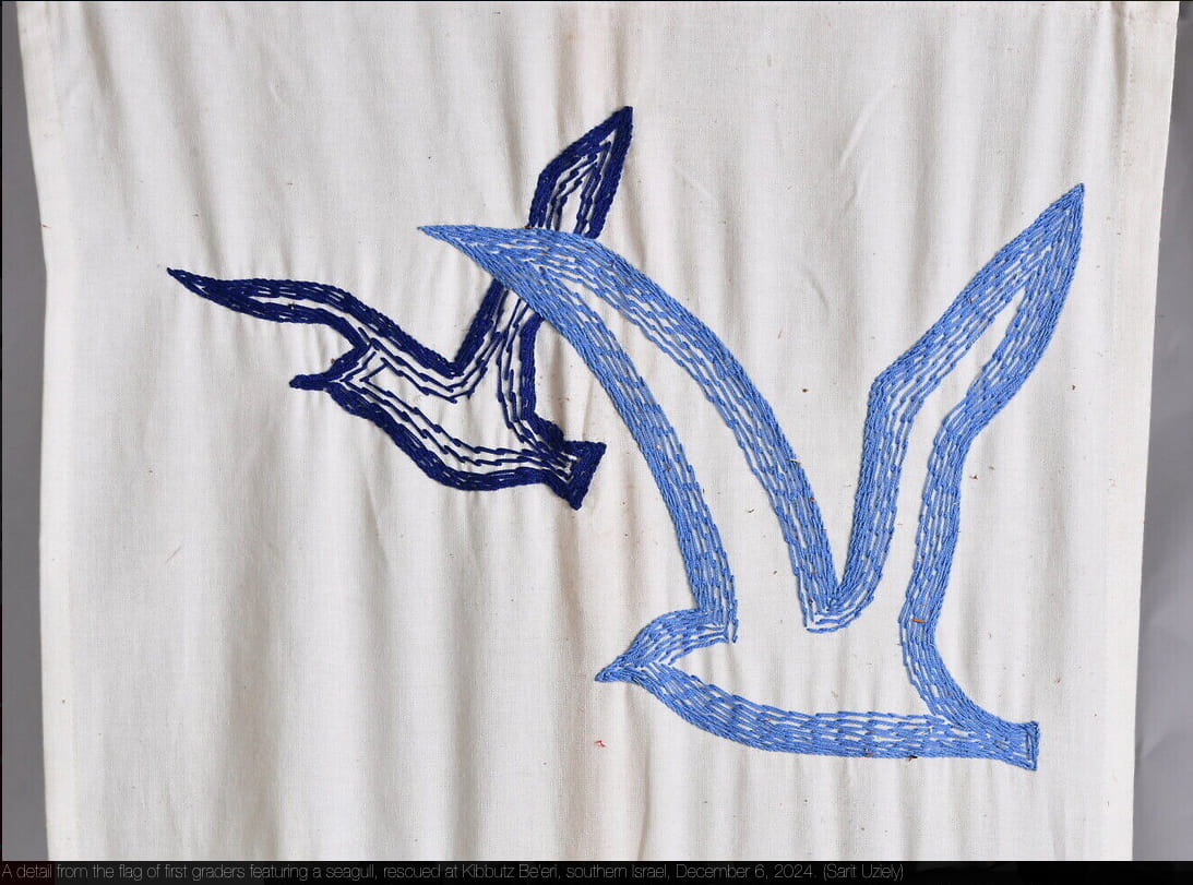 A team of surviving residents of Kibbutz Be'eri, textile experts and a Bedouin embroidery maven have rescued several hand-made school banners from under the rubble of kibbutz Be'eri. Each banner bears the name and image of a fruit, plant, or bird, and has been lovingly embroidered, painted, or decorated with applique for the kibbutz's traditional start-of-school-year ceremony; a tradition that has existed since 1952. The kibbutz was one of the places worst hit by Hamas-led Palestinians on 7 October 2023. The storeroom of the flags was destroyed, but luckily not burned. The team is supported by Dr. Nirit Shalev-Khalifa from Visual History Department at Yad Ben-Zvi, the Jerusalem-based state research, culture, and education institution. She is collecting items whose materials, form, or function have been altered by events such as fire, smoke, and bullets. She only learned about the Be'eri flags in December 2023, thanks to a Be'eri resident, who runs the kibbutz archive. Together they retrieve and repair the 71 banners in the best way possible (see pictures on this page and in the Times of Israel article). Shalev-Khalifa said that after seeing so many burned-out houses and murder sites, the flags were "the first thing we came across that could be repaired and raised, that would return to life". Indeed these banners seem to say: Life is stronger than death. The enemy may do us harm, unspeakable harm, but he will not overcome us. We live and will live.