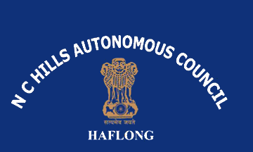 Reported as the "Unconfirmed flag of the North Cachar Hills Autonomous Council, Assam", a blue flag with name arched over the Indian national emblem.