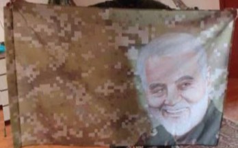 A flag with a pixel, sandy "desert camouflaged" field with a smiling facial portrait of Iran "Quds Force" Gen. Qassem Soleimani, allegedly being used by Iranian militiamen (IRGC?) supporting Russian military operations inside eastern Ukraine; as seen perhaps near the city of Avdiivka c. Feb. 2024.