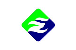 The town emblem and the flag were adopted on Mar 20th 2006 by Notice No 1. The white flag has a green, a blue and a white three color town emblem in the center. The town emblem is a stylized hiragana え E of Esashi. The diamond shape symbolizes Hokkaido. It represenst an union of a forest town (green) and a sea town (blue).