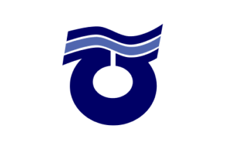 The town emblem was adopted on Mar 1st 2007 by Notice No 11 but there is no flag law. The white flag has a blue and a light blue two color town emblem in the center. The town emblem is a stylized hiragana ひ Hi of Higashiagatsuma. The upper part symbolizes Agatsuma River running east and west thru the town and the wave does a breath of nature. The blue color stands for a blue sky and a bright future.