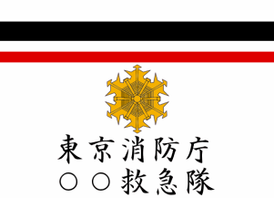 The white flag charged with yellow Tokyo Fire Dept emblem, one black and one red horizontal stripes and the crew name in black on the bottom. The flag size is 46cm x 64cm