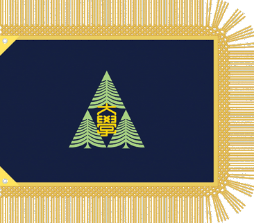The university flag has navy blue background with a gold and green emblem and horizontally written white kanji university name.