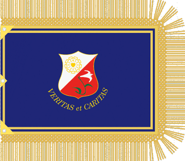 Located in Shinagawa City Tokyo and established in 1950. The embroidered ceremonial flag has blue background with a red,white,gold and green emblem with arc gold “Veritas et Caritas” founding spirit meaning"true knowledge" "true love" in gold fringe. The school emblem is decorated with lilies in the shape of the letter "S", the first letter of the name Seisen, for purity. The shield shape represents "righteousness". The Sacred Heart of Christ represents "the love of God" and the chains surrounding the Sacred Heart represent "mutual love and a sense of community among human beings" as children of God.