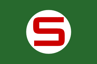 The tiny house flag (drawing) shown has a green field bearing a white disk with a large red initial ‘S’ (no serifs discernible). (In conception this one very much resembles the flag of Samin Line, Syria).
