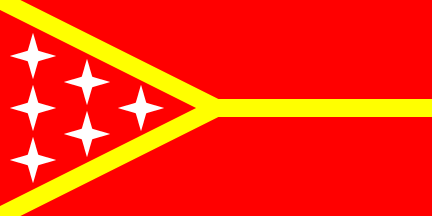 The flag of Nikunau Atoll is red with a yellow pall and six 4-pointed stars in the hoist triangle.