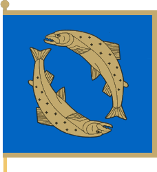 salmon swimming circularly bendwise. Flag proportions 10:11, free