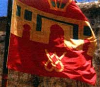 red field has a gold muncipal wall with green reliefs. A gate, which is