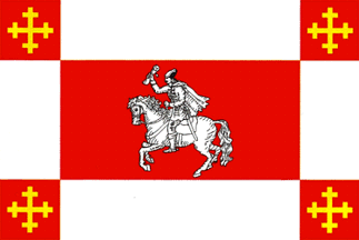 The flag is white with a central red rectangle extending out to four red squares, one in each corner. On each red square is a yellow cross crosslet, and on the central red rectangle is a white knight on a white horse.