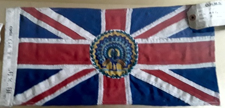 I have a flag, with peacock centre, dated 1940, multiple panels sewn together, framed, with a bag with 2 notes, Japanese occupation currency, and an OHMS brown paper tag, also a plastic label saying "The last British flag flown in Burma removed by HMS Birmingham". Colin Cleveland, 19 October 2018
