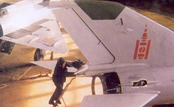 MiG-21PFM with: "A Red Mongolian Zoyombo insignia is used on the fin sides