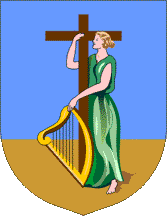 The arms show a woman with a harp, embracing a passion cross.