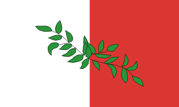 Blazon: Per pale Argent and Gules overall a laurel (?) branch Vert in bend.